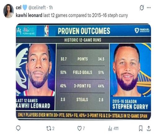 ESPN官方还晒出一组数据,小卡是15-16赛季库里后连续12场比赛能完成场均30+2.5抢断+命中率50%+三分命中率40%的球员,小卡实在是太强悍了。