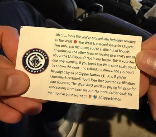 为其他球队加油,或者穿着与洛杉矶快船无关的装备?在我们这里不行。这是我们唯一的警告。如果你再次违反‘墙’的规则,你将被请出场——不退款,不留情面,是的,你会受到所有快船球迷的审判。如果你获得了Chuckmark认证(快船死忠区域成员资格)?你将失去这项令人垂涎的认证,失去进入‘墙’的资格!而且从现在开始,你将全价购买特许经营商品。你再也没有内部优惠了。警告过你了!#快船国度”